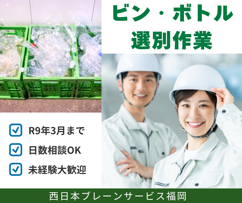給与 1,250円【西区太郎丸】1年間限定/空き瓶やペットボトルの選別/日数相談OK/11時スタート(福岡市西区太郎丸