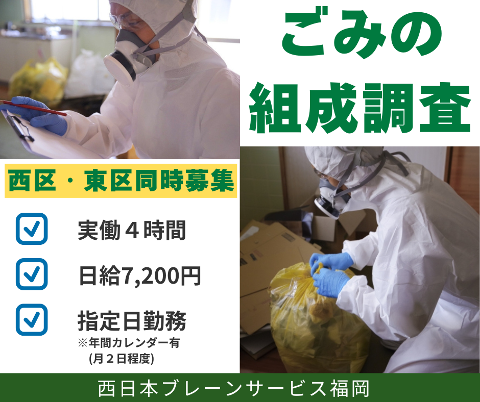 【東区箱崎ふ頭】福岡市のごみ調査/月2回程度の指定日勤務/1日4時間/日給7,200円/西区でも同時募集